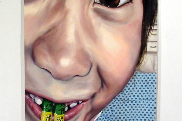 Joy; Oil on canvas, flocking, composition leaf, wooden dowels; 62”x24”; 2005
