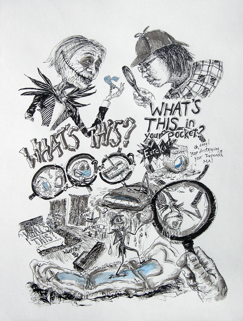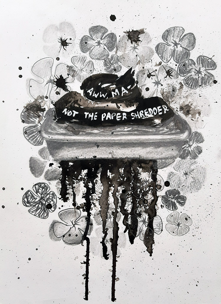 Opening the Curtain; ink, watercolor on paper; 11.25″x20.25″; 2020.