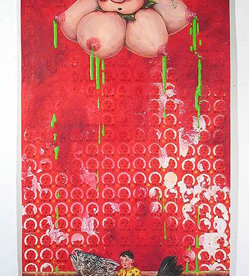 Yellow Peril #2; Oil and collage on canvas, wooden dowels; 44”x22”; 2006